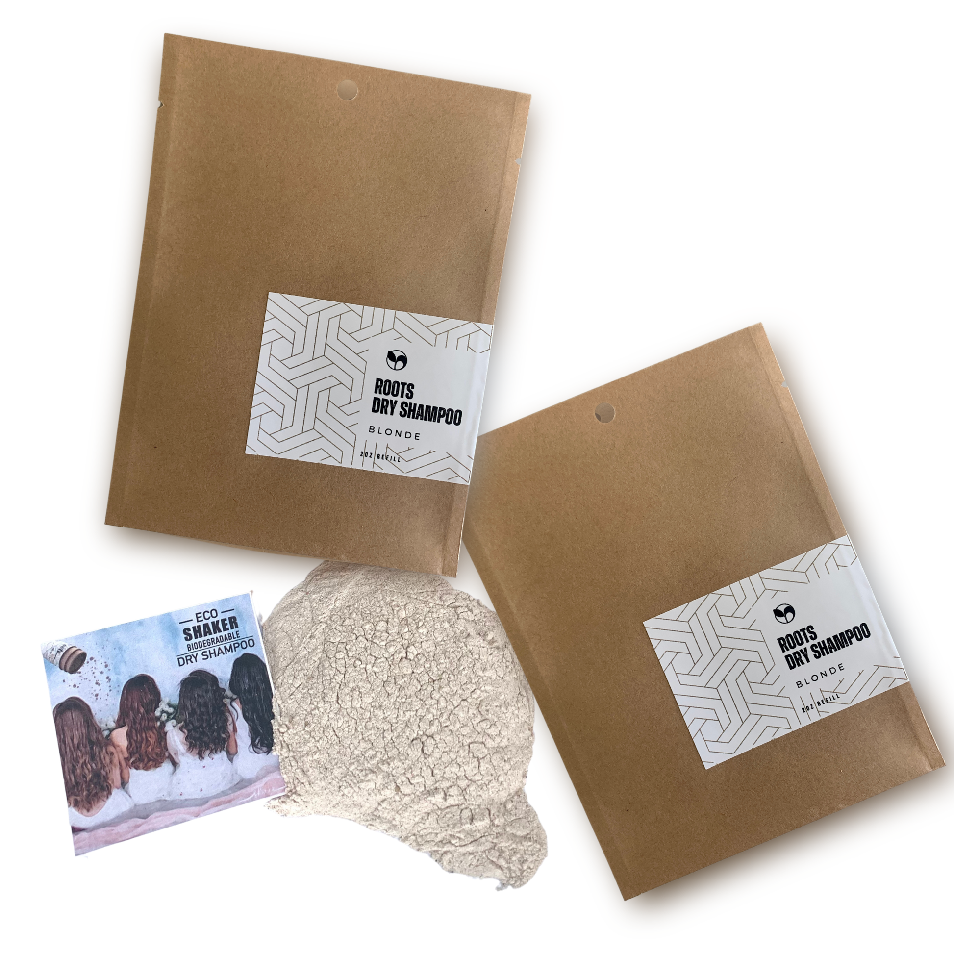 - ECO Set includes: 2 oz biodegradable paperboard shaker container with 2 oz dry shampoo refill bag for blondes, brunettes, red hair, or black hair.